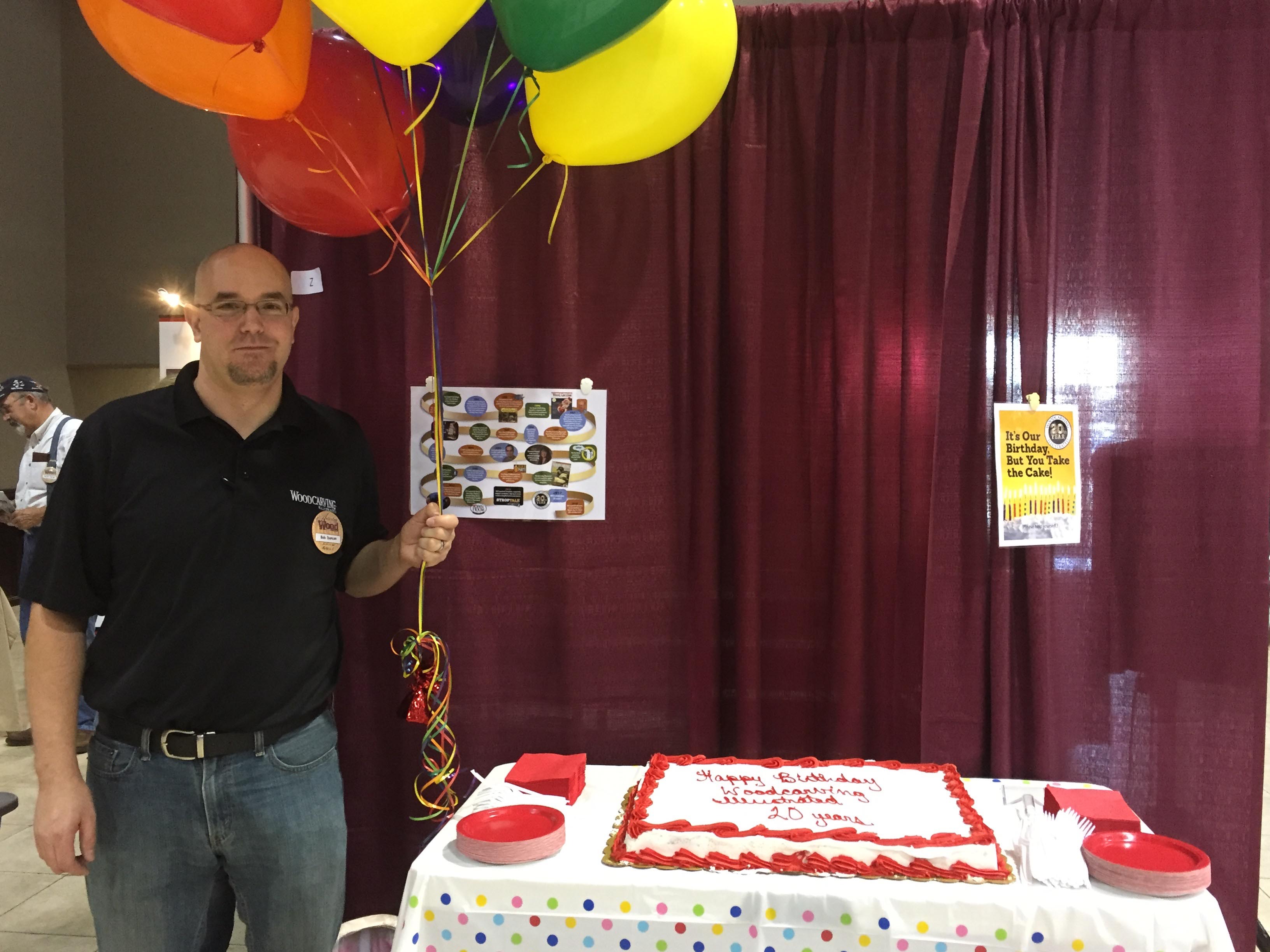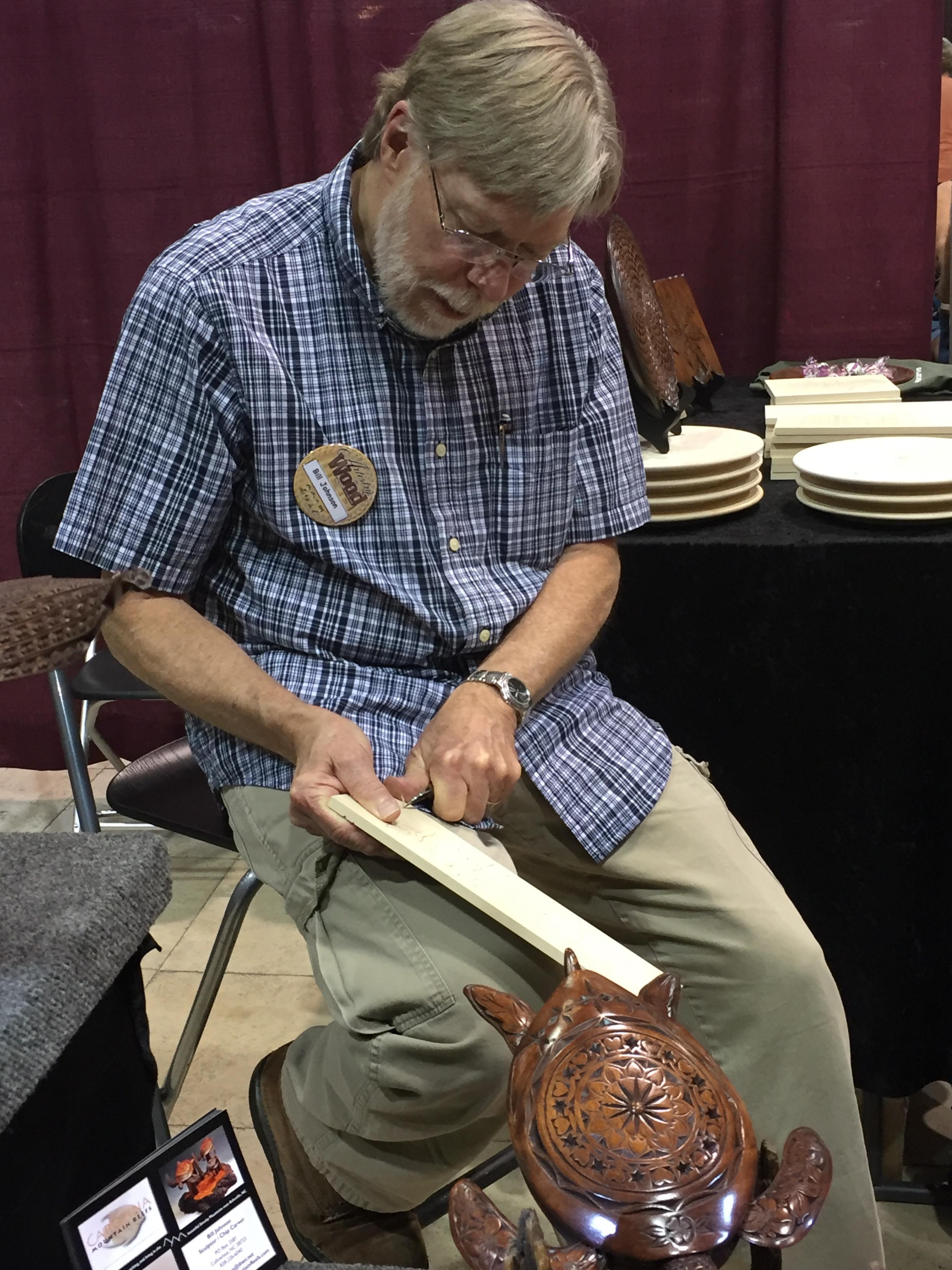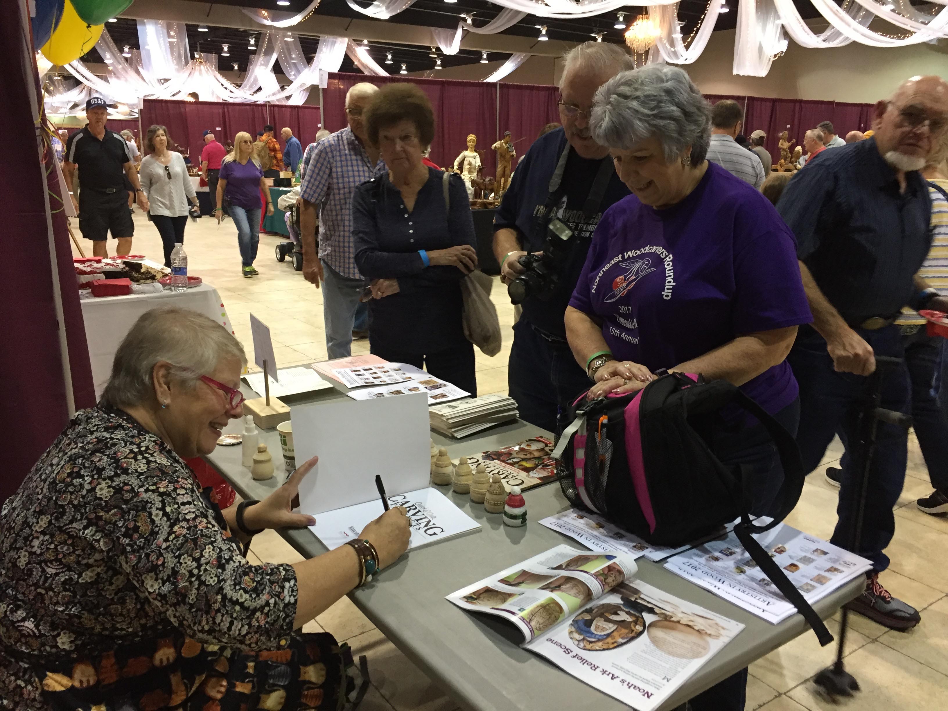The WCI booth was busy during the show. We celebrated the 20th anniversary of Woodcarving Illustrated magazine with cake each day, and it went fast! In addition, we had several booth guests. Lori Dickie, the author of Quick & Cute Carving Patterns, demonstrated carving wooden eggs into caricatures. Wayne and Jacob Fowler, the authors of Woodworkers Pattern Book, showed numerous examples of their complexly scrolled animal portraits. We were proud that many of our book authors were at the show, including Floyd Rhadigan, Bruce Nicholas, Tom Hindes, and Judy Gale Roberts. We also presented the Woodcarver of the Year Award to Janet Cordell.