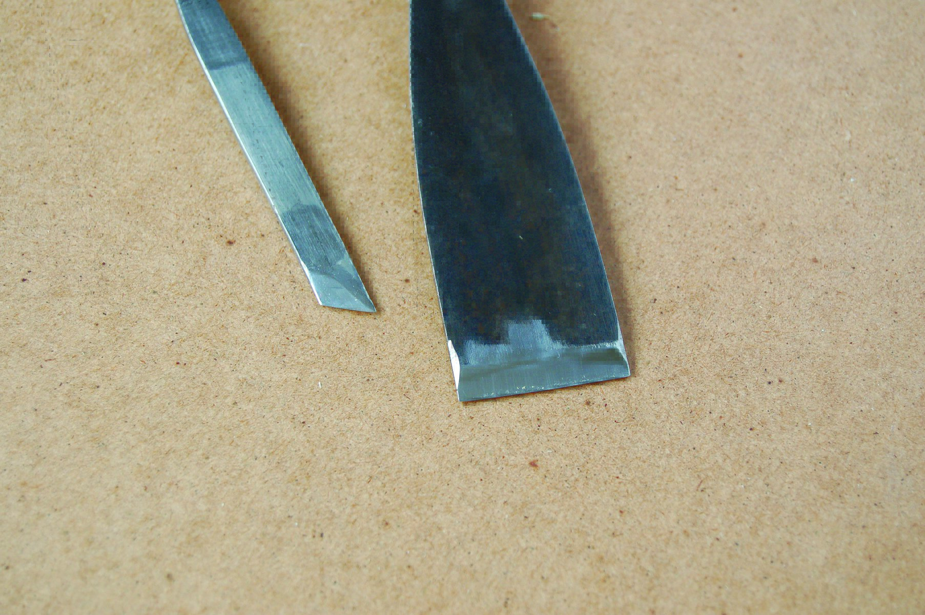 Besides differing when looked at on end, carving tools also differ in their lengthways appearance: their longitudinal shape. The common, parallel-sided regular gouge is shown on the left. The other is what is known as an ‘allongee’ shape—somewhat lighter.