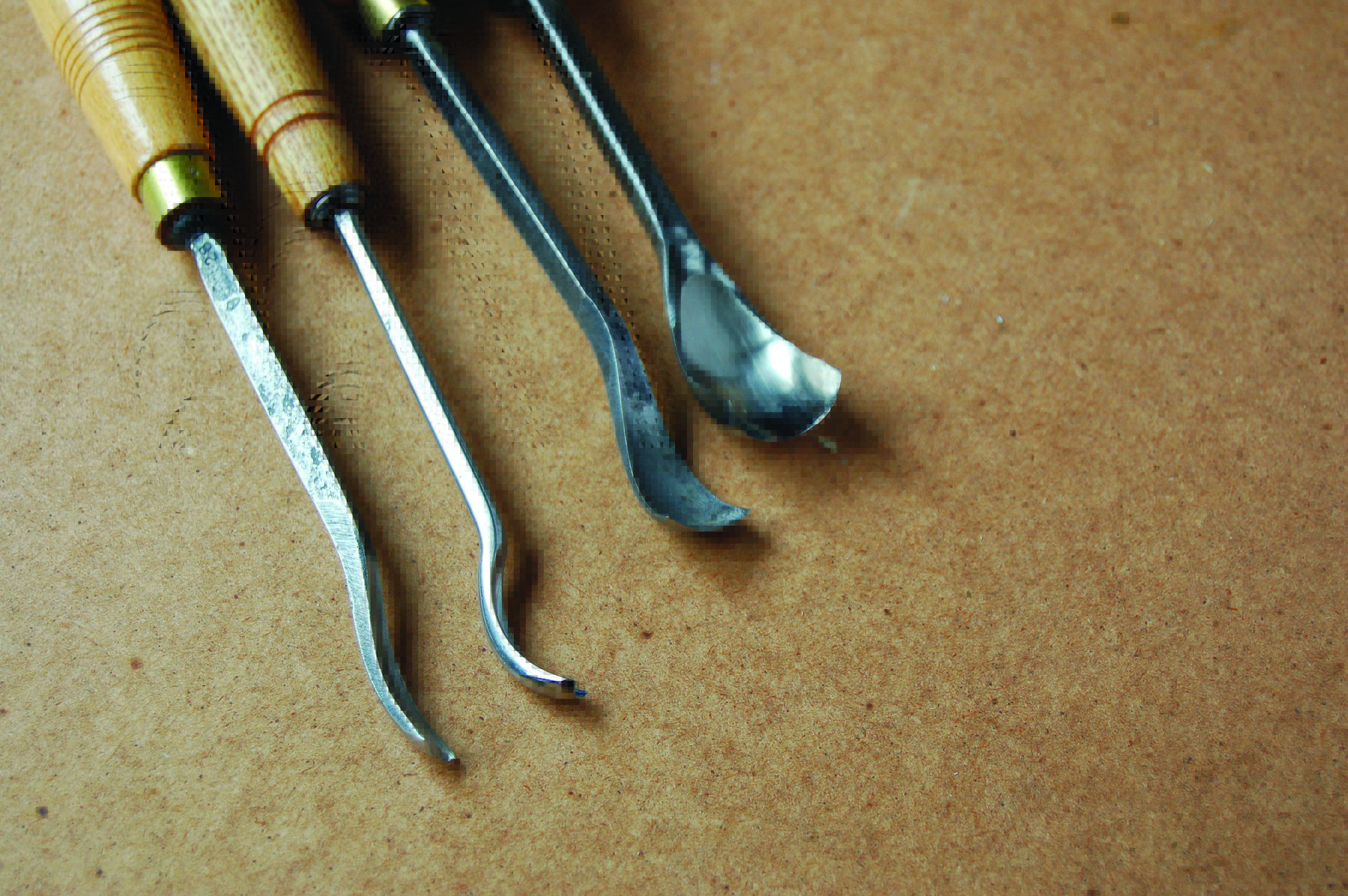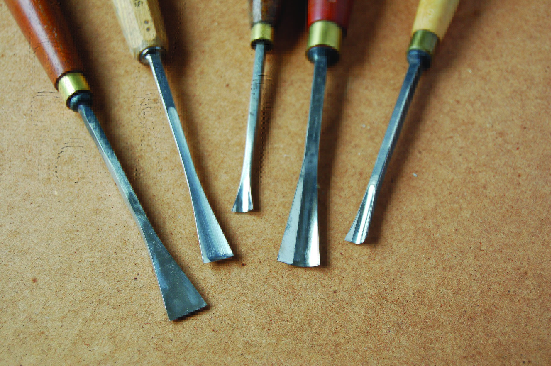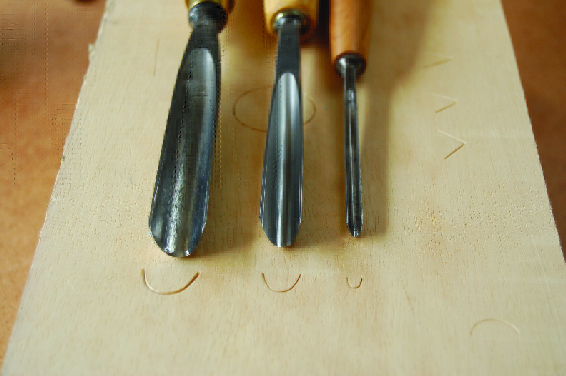 Regular gouges: roughly the same width of carving tool but differing depths: the one on the left is flattest, the one on the right a semicircle and the others lie in between.