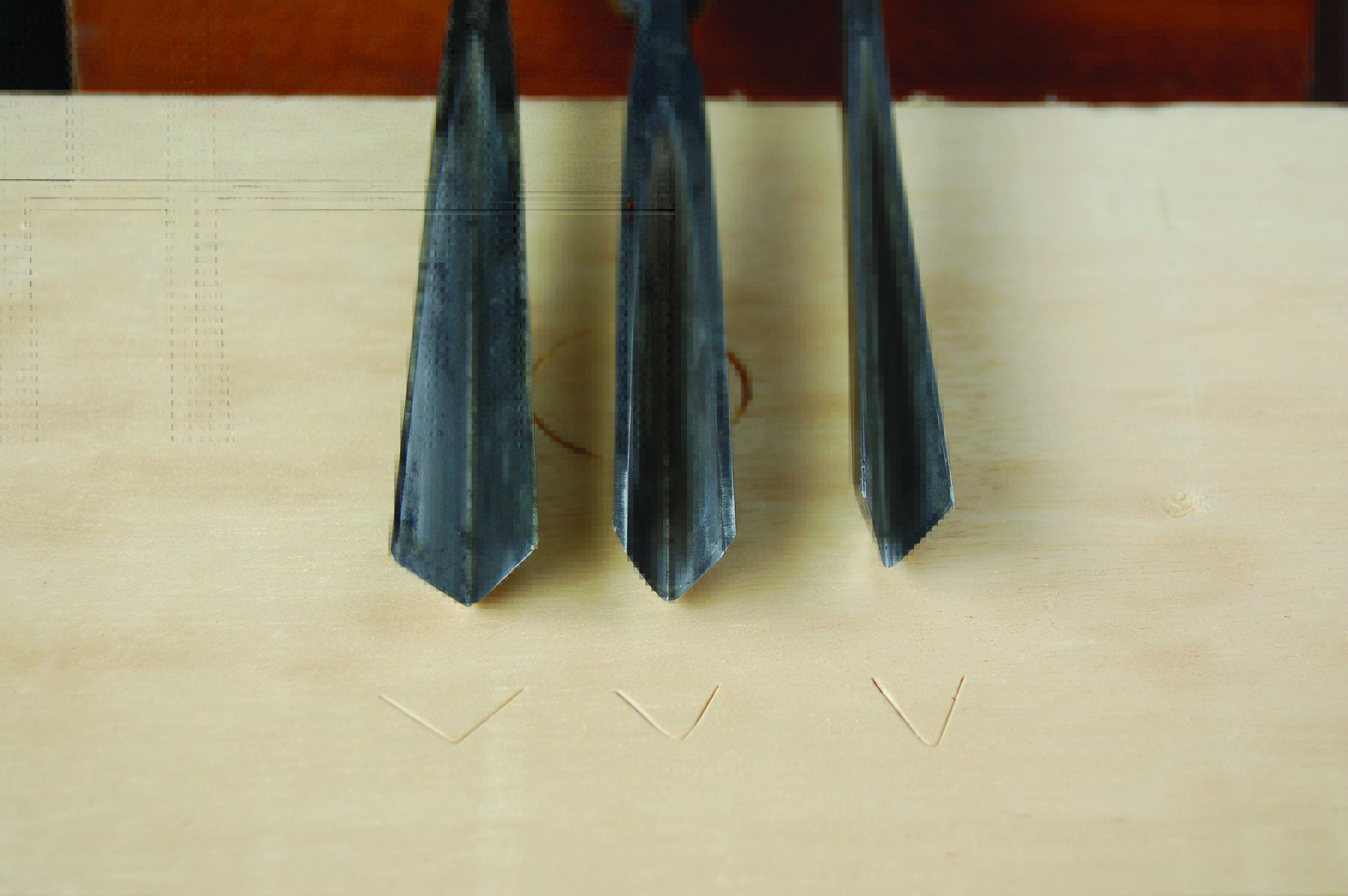 In the charts you will also see sweeps that look like a “V”: these are called “V” or parting tools. The tool consists of two chisels joined at an angle that varies from 45˚ to 90˚, with 60˚ being the most useful. You would use the V-tool for separating (parting) one element in a carving from another, or for drawing lines, somewhat like a veiner.